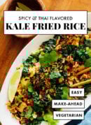 A vegetarian weeknight fried rice with sautรฉed kale, coconut flakes and rice. The dish is finished with Thai flavors like lime, cilantro and sriracha. For best results, cook your rice in advance and refrigerate until youโ€™re ready to start cooking (see note). This dish comes together very quicklyโ€”be sure to have your ingredients prepped ahead of time and placed near the stove, along with a big empty bowl for the cooked components. Recipe yields 2 servings.